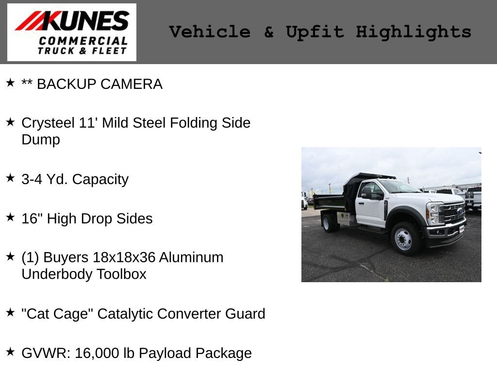 ** BACKUP CAMERA, Crysteel 11' Mild Steel Folding Side Dump, 3-4 Yd. Capacity, 16" High Drop Sides, (1) Buyers 18x18x36 Aluminum Underbody Toolbox, "Cat Cage" Catalytic Converter Guard, GVWR: 16,000 lb Payload Package.