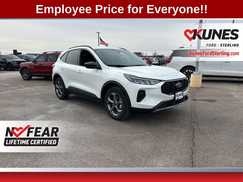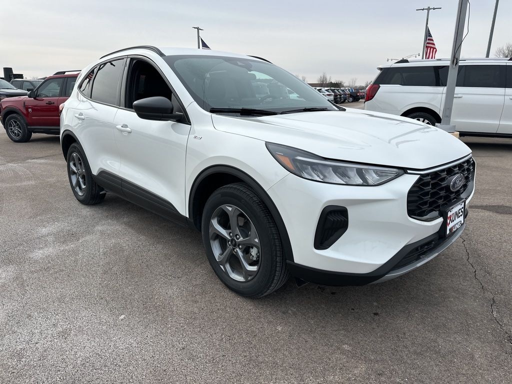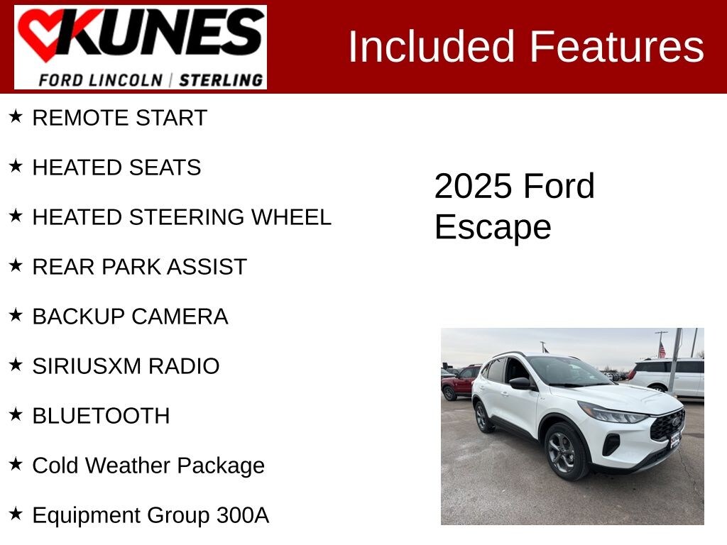 Star White Metallic Tri-Coat 2025 Ford Escape ST-Line REMOTE START, HEATED SEATS, HEATED STEERING WHEEL, REAR PARK ASSIST, BACKUP CAMERA, SIRIUSXM RADIO, BLUETOOTH, Escape ST-Line, 4D Sport Utility, 1.5L EcoBoost, 8-Speed Automatic, AWD, Star White Metallic Tri-Coat, Ebony, Cold Weather Package, Equipment Group 300A, 3.81 Axle Ratio, 4-Wheel Disc Brakes, 6 Speakers, ABS brakes, Air Conditioning, Alloy wheels, AM/FM radio: SiriusXM, AM/FM Stereo, Auto High-beam Headlights, Automatic temperature control, Brake assist, Bumpers: body-color, Compass, Delay-off headlights, Driver door bin, Driver vanity mirror, Dual front impact airbags, Dual front side impact airbags, Electronic Stability Control, Emergency communication system: SYNC 4 911 Assist, FordPass Connect, Four wheel independent suspension, Front anti-roll bar, Front Bucket Seats, Front Center Armrest, Front dual zone A/C, Front License Plate Bracket, Front reading lights, Fully automatic headlights, Heated Front Row Seats, Heated Sideview Mirrors, Heated Steering Wheel, Illuminated entry, Internet access capable: FordPass Connect 4G, Knee airbag, Low tire pressure warning, Occupant sensing airbag, Outside temperature display, Overhead airbag, Overhead console, Panic alarm, Passenger door bin, Passenger vanity mirror, Power door mirrors, Power driver seat, Power Liftgate, Power steering, Power windows, Radio data system, Rear anti-roll bar, Rear reading lights, Rear seat center armrest, Rear window defroster, Rear window wiper, Remote keyless entry, Remote Starter System, Speed control, Speed-sensing steering, Speed-Sensitive Wipers, Split folding rear seat, Spoiler, Sport steering wheel, Steering wheel mounted audio controls, SYNC 4, Tachometer, Telescoping steering wheel, Tilt steering wheel, Traction control, Trip computer, Variably intermittent wipers, Vinyl/Cloth Front Sport Contour Bucket Seats, Wheels: 18" Rock Metallic Painted Aluminum, Escape ST-Line, 4D Sport Utility, 1.5L EcoBoost, 8-Speed Automatic, AWD, Star White Metallic Tri-Coat, Ebony, Cold Weather Package, Equipment Group 300A. 26/32 City/Highway MPG