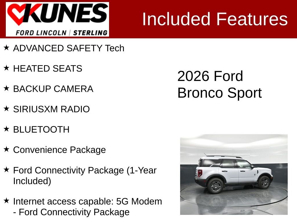 The 2026 Bronco Sport gives you all the passenger and storage space you need along with a fantastic 30 MPG highway! Also included with every new vehicle: LIFETIME "NO FEAR" WARRANTY and AT HOME COURTESY DELIVERY! Call us for full details! We pride ourselves on honesty and integrity, but please note that mistakes or misprints due to human error are possible. Find out why our dealerships have won DealerRater.com DEALER OF THE YEAR a whopping 10 TIMES! Call, email, or live chat with one of our friendly sales professionals now to schedule your test drive! Prices shown do not include taxes, license, and title fees and a $377.63 documentary service fee, and $399 Security Fee. Price includes: Price Includes: $2000 - Trade in assistance. Exp. 12/31/2026 Trade In Allowance. Trade must be 2020 or newer and have less than 65k miles