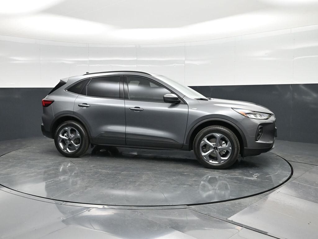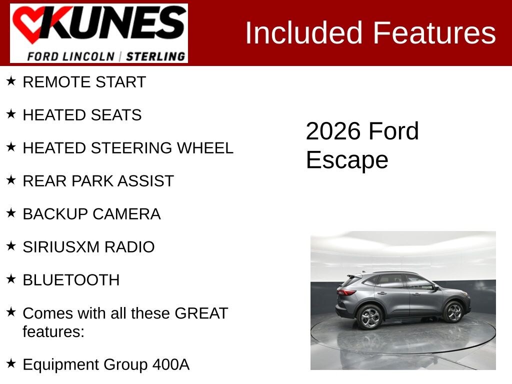 Carbonized Gray Metallic 2026 Ford Escape Hybrid ST-Line Select REMOTE START, HEATED SEATS, HEATED STEERING WHEEL, REAR PARK ASSIST, BACKUP CAMERA, SIRIUSXM RADIO, BLUETOOTH, Comes with all these GREAT features:, Escape Hybrid ST-Line Select, 4D Sport Utility, 2.5L iVCT, eCVT, AWD, Carbonized Gray Metallic, Ebony PARTIAL VINYL/CLOTH SEATS, Equipment Group 400A, 2.91 Axle Ratio, 4-Wheel Disc Brakes, 6 Speakers, ABS brakes, Air Conditioning, Alloy wheels, Auto High-beam Headlights, Automatic temperature control, Brake assist, Bumpers: body-color, Compass, Delay-off headlights, Driver door bin, Driver vanity mirror, Dual front impact airbags, Dual front side impact airbags, Electronic Fuel Door Release, Electronic Stability Control, Emergency communication system: SYNC 4 911 Assist, Ford App, Four wheel independent suspension, Front anti-roll bar, Front Bucket Seats, Front Center Armrest, Front dual zone A/C, Front fog lights, Front License Plate Bracket, Front reading lights, Fully automatic headlights, Heated door mirrors, Heated front seats, Heated steering wheel, Illuminated entry, Knee airbag, Low tire pressure warning, Neutral Towing Capability, Occupant sensing airbag, Outside temperature display, Overhead airbag, Overhead console, Panic alarm, Passenger door bin, Passenger vanity mirror, Pedestrian Alert Sounder, Power door mirrors, Power driver seat, Power Liftgate, Power steering, Power windows, Radio data system, Rear anti-roll bar, Rear reading lights, Rear seat center armrest, Rear window defroster, Rear window wiper, Remote keyless entry, Speed control, Speed-sensing steering, Speed-Sensitive Wipers, Split folding rear seat, Spoiler, Sport steering wheel, Steering wheel mounted audio controls, SYNC 4, Tachometer, Telescoping steering wheel, Tilt steering wheel, Traction control, Trip computer, Variably intermittent wipers, Wheels: 18" Rock Metallic Painted Aluminum, Escape Hybrid ST-Line Select, 4D Sport Utility, 2.5L iVCT, eCVT, AWD, Carbonized Gray Metallic, Ebony PARTIAL VINYL/CLOTH SEATS, Equipment Group 400A. 42/36 City/Highway MPG