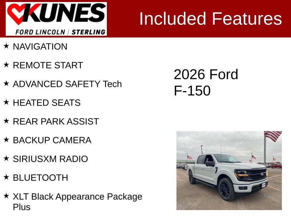 The 2026 F-150 gives you all the passenger and storage space you need along with a fantastic 22 MPG highway! Also included with every new vehicle: LIFETIME "NO FEAR" WARRANTY and AT HOME COURTESY DELIVERY! Call us for full details! We pride ourselves on honesty and integrity, but please note that mistakes or misprints due to human error are possible. Find out why our dealerships have won DealerRater.com DEALER OF THE YEAR a whopping 10 TIMES! Call, email, or live chat with one of our friendly sales professionals now to schedule your test drive! Prices shown do not include taxes, license, and title fees and a $377.63 documentary service fee, and $399 Security Fee. Price includes: $2000 - Retail Customer Cash. Exp. 03/31/2026 $