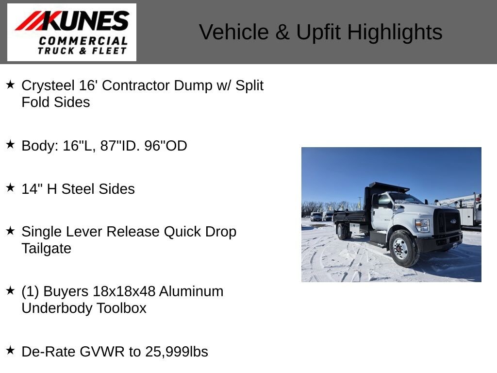 Crysteel 16' Contractor Dump w/ Split Fold Sides, Body: 16"L, 87"ID. 96"OD, 14" H Steel Sides, Single Lever Release Quick Drop Tailgate, (1) Buyers 18x18x48 Aluminum Underbody Toolbox, De-Rate GVWR to 25,999lbs.