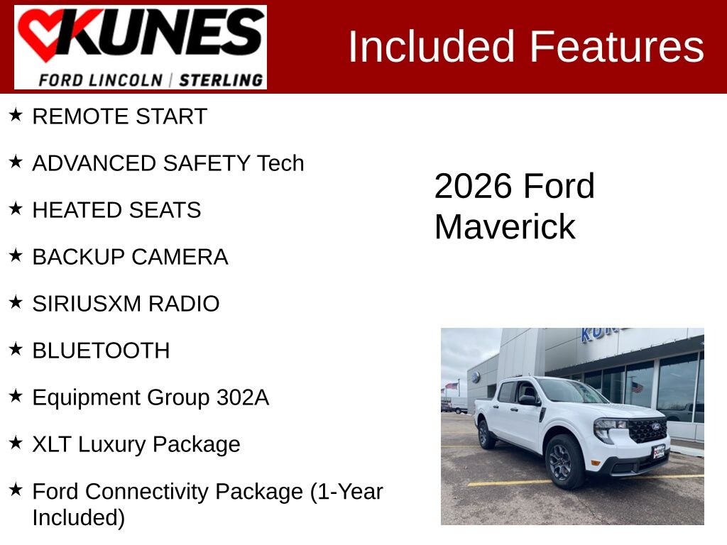 Oxford White 2026 Ford Maverick XLT REMOTE START, ADVANCED SAFETY Tech, HEATED SEATS, BACKUP CAMERA, SIRIUSXM RADIO, BLUETOOTH, Maverick XLT, 4D Crew Cab, EcoBoost 2.0L I4 GTDi DOHC Turbocharged VCT, 8-Speed Automatic, AWD, Oxford White, Blue Cloth, Equipment Group 302A, Ford Connectivity Package (1-Year Included), Internet access capable: 5G Modem - Ford Connectivity Package, XLT Luxury Package. 22/30 City/Highway MPG