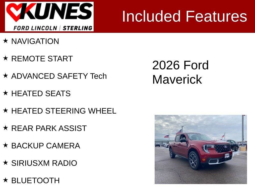Ruby Red Metallic Tinted Clearcoat 2026 Ford Maverick Lariat NAVIGATION, REMOTE START, ADVANCED SAFETY Tech, HEATED SEATS, HEATED STEERING WHEEL, REAR PARK ASSIST, BACKUP CAMERA, SIRIUSXM RADIO, BLUETOOTH, Maverick Lariat, 4D Crew Cab, 2.5L I-4 Hybrid, CVT, AWD, Ruby Red Metallic Tinted Clearcoat, Smoked Truffle Leatherette, Equipment Group 501A, Ford Connectivity Package (1-Year Included), Ford Connectivity Package (one-Time Purchase - 7 Years), Internet access capable: 5G Modem - Ford Connectivity Package, Navigation system: Connected Navigation. 40/34 City/Highway MPG