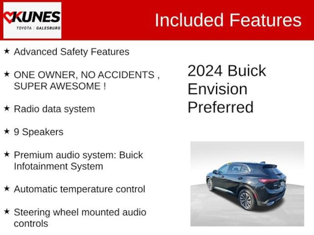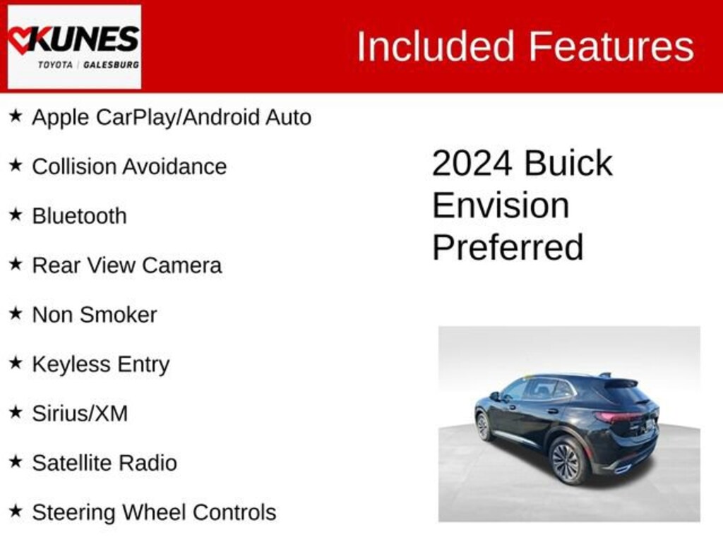 2024 Buick Envision Preferred Ebony Twilight Metallic Recent Arrival! CARFAX One-Owner. Clean CARFAX. Apple CarPlay/Android Auto, Collision Avoidance, Bluetooth, Rear View Camera, Non Smoker, Keyless Entry, Sirius/XM, Satellite Radio, Steering Wheel Controls, Advanced Safety Features, ONE OWNER, NO ACCIDENTS , SUPER AWESOME !, 9 Speakers, Automatic temperature control, Driver 8-Way Power Seat Adjuster, Emergency communication system: OnStar and Buick connected services capable, Front Bucket Seats, Front Center Armrest, Front Passenger 6-Way Manual Seat Adjuster, Premium audio system: Buick Infotainment System, Radio data system, Rear reading lights, Rear seat center armrest, Rear window wiper, Split folding rear seat, Spoiler, Steering wheel mounted audio controls, Trip computer.