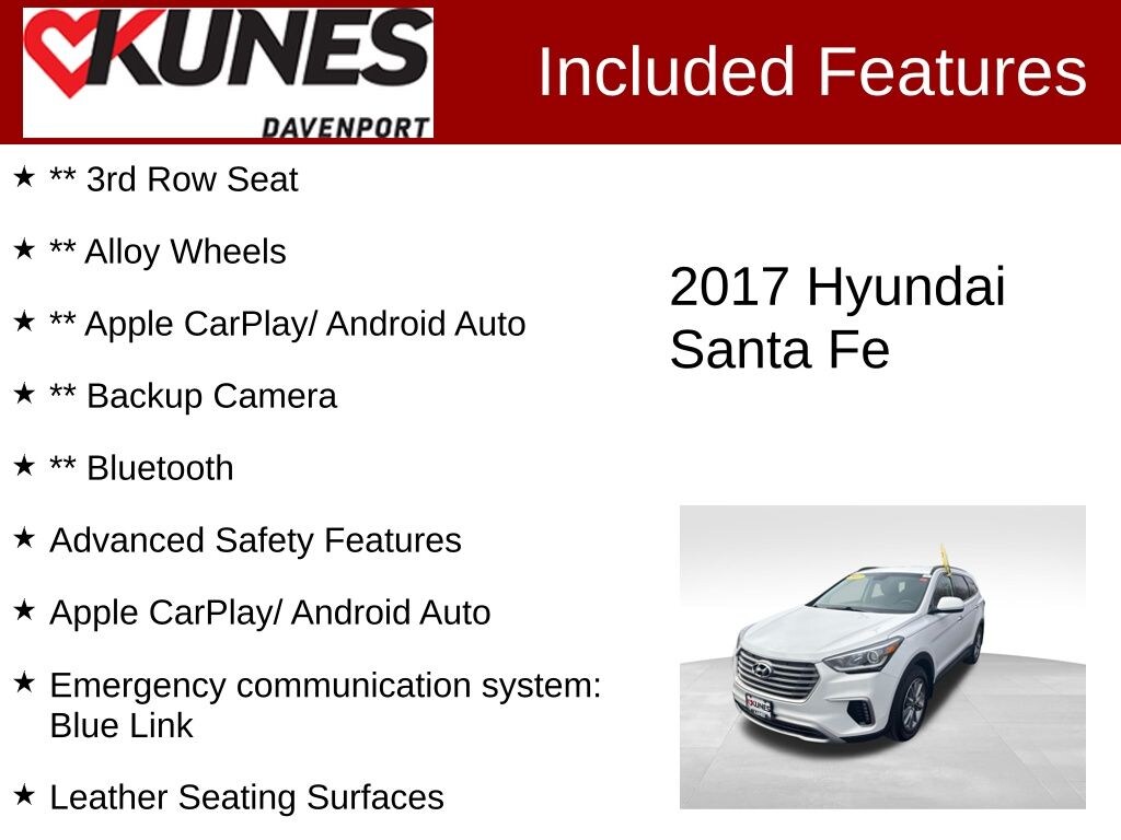 ** 3rd Row Seat, ** Alloy Wheels, ** Apple CarPlay/ Android Auto, ** Backup Camera, ** Bluetooth, Advanced Safety Features, Apple CarPlay/ Android Auto, Gray Cloth, Emergency communication system: Blue Link, Leather Seating Surfaces.