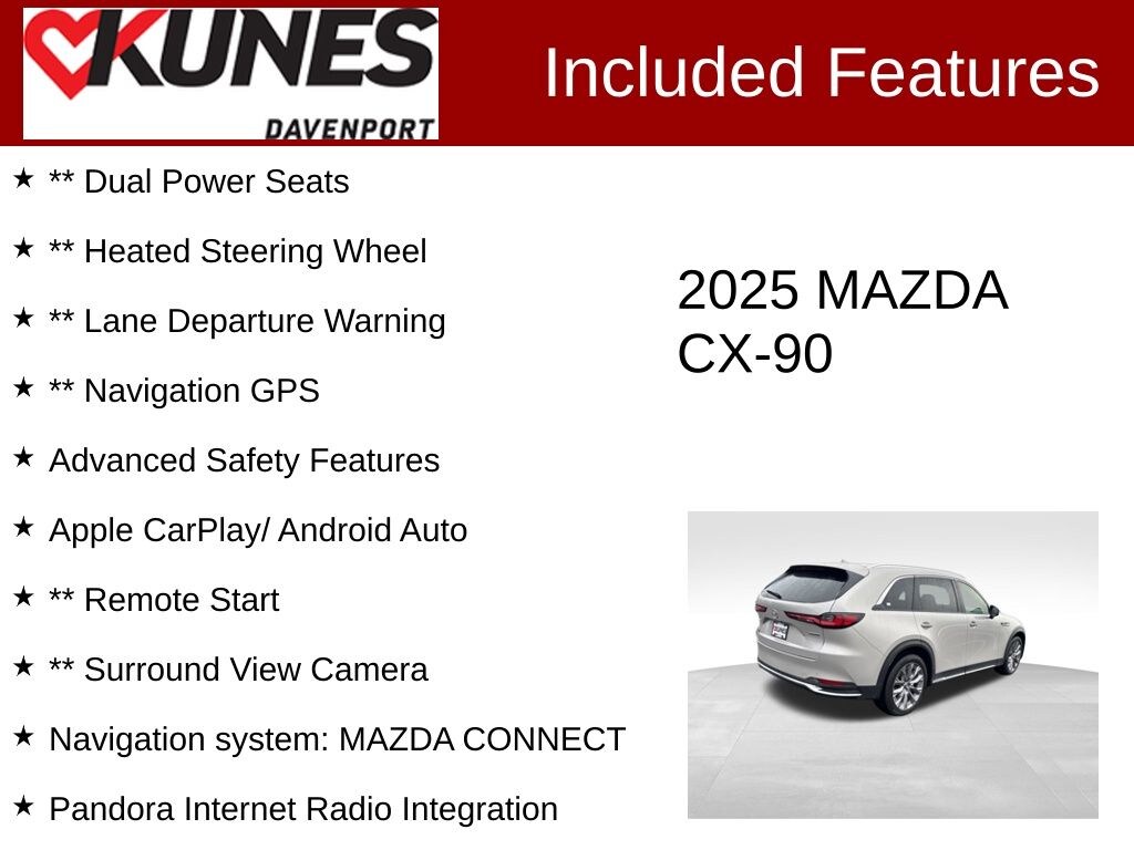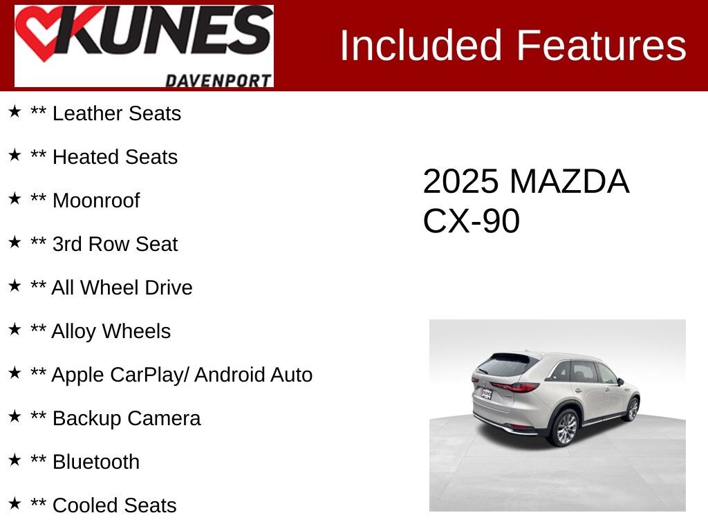 ** Leather Seats, ** Heated Seats, ** Moonroof, ** 3rd Row Seat, ** All Wheel Drive, ** Alloy Wheels, ** Apple CarPlay/ Android Auto, ** Backup Camera, ** Bluetooth, ** Cooled Seats, ** Dual Power Seats, ** Heated Steering Wheel, ** Lane Departure Warning, ** Navigation GPS, Advanced Safety Features, Apple CarPlay/ Android Auto, ** Remote Start, ** Surround View Camera, 12 Speakers, 3rd row seats: bench, Air Conditioning, AM/FM radio: SiriusXM, Automatic temperature control, Compass, Delay-off headlights, Emergency communication system: MAZDA CONNECT, Front Center Armrest w/Storage, Fully automatic headlights, Infotainment System Voice Command, Low tire pressure warning, Mazda Navigation System, Navigation system: MAZDA CONNECT, Occupant sensing airbag, Outside temperature display, Overhead airbag, Pandora Internet Radio Integration, Radio Broadcast Data System Program Information, Radio data system, Radio: AM/FM w/HD/Bose 12-Speaker Sound System, SMS Text Msg Audio Delivery & Reply, Speed-sensing steering, Split folding rear seat, Wheels: 21" x 9.5J Aluminum Alloy.