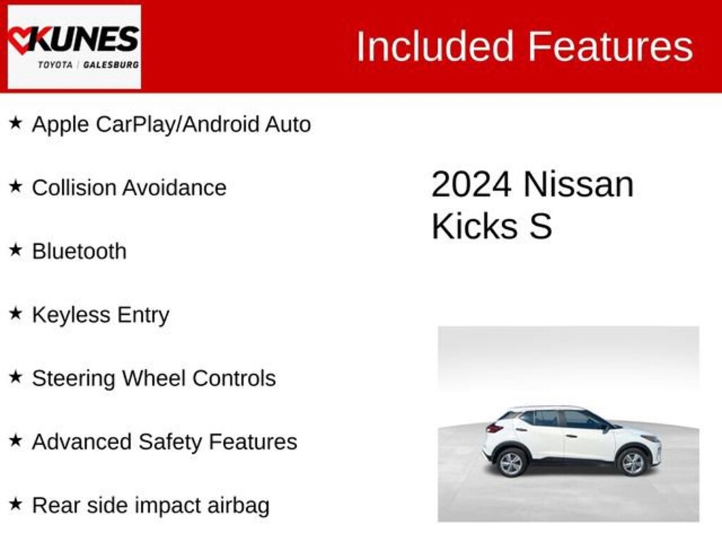2024 Nissan Kicks S Fresh Powder Recent Arrival! CARFAX One-Owner. Apple CarPlay/Android Auto, Collision Avoidance, Bluetooth, Keyless Entry, Steering Wheel Controls, Advanced Safety Features, Rear side impact airbag.