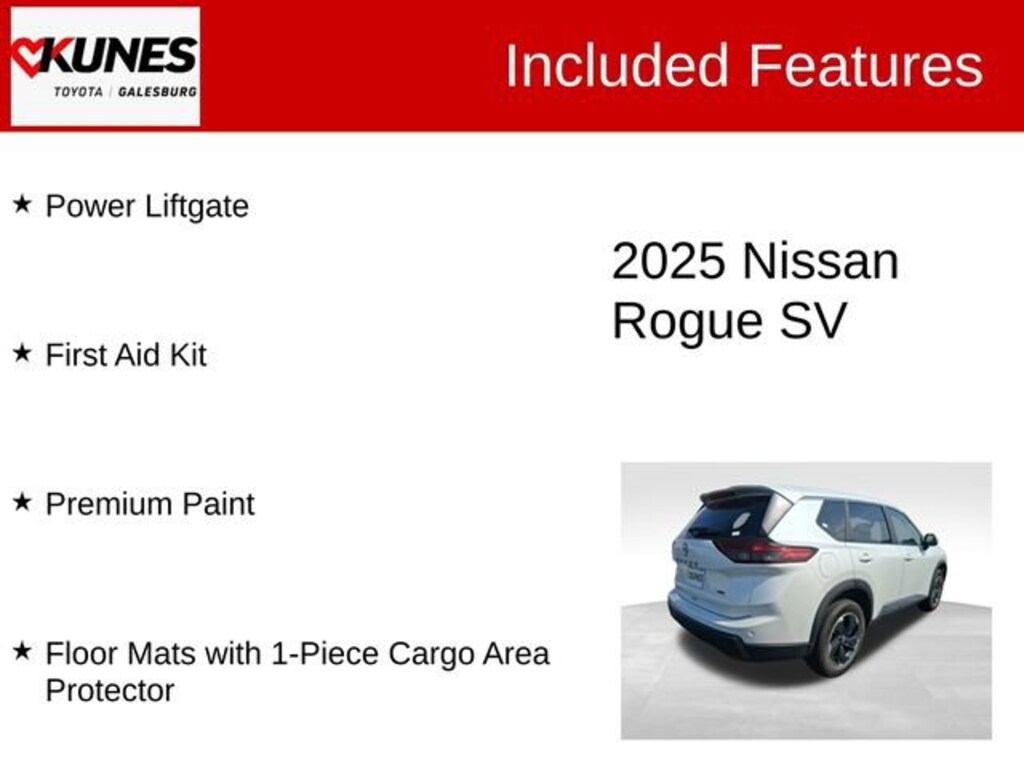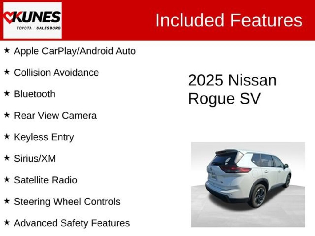 2025 Nissan Rogue SV Everest White Pearl Recent Arrival! CARFAX One-Owner. Apple CarPlay/Android Auto, Collision Avoidance, Bluetooth, Rear View Camera, Keyless Entry, Sirius/XM, Satellite Radio, Steering Wheel Controls, Advanced Safety Features, AWD, First Aid Kit, Floor Mats with 1-Piece Cargo Area Protector, Power Liftgate, Premium Paint.