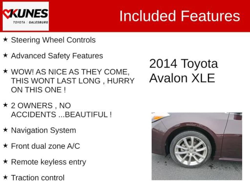 2014 Toyota Avalon XLE Touring Red Clean CARFAX. Bluetooth, Rear View Camera, Non Smoker, Local Trade, Leather, Heated Seats, Keyless Entry, Keyless Ignition, Sunroof/Moonroof, Steering Wheel Controls, Advanced Safety Features, WOW! AS NICE AS THEY COME, THIS WONT LAST LONG , HURRY ON THIS ONE !, 2 OWNERS , NO ACCIDENTS ...BEAUTIFUL !, 6-Speed Automatic ECT-i, ABS brakes, Alloy wheels, Compass, Electronic Stability Control, Front dual zone A/C, Heated door mirrors, Heated front seats, Illuminated entry, Leather Seat Trim, Low tire pressure warning, Navigation System, Power moonroof, Remote keyless entry, Traction control.