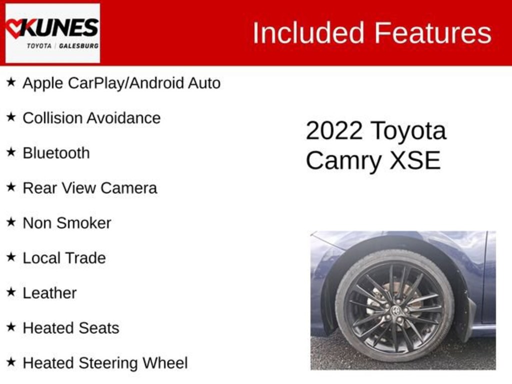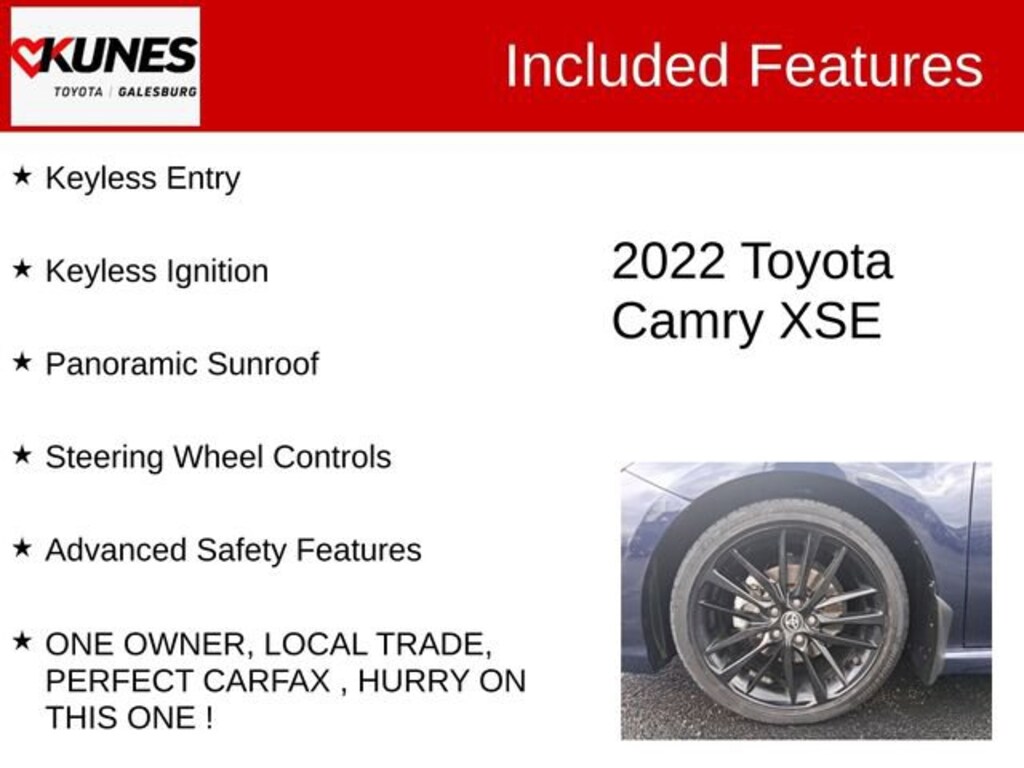 2022 Toyota Camry XSE Blueprint Recent Arrival! CARFAX One-Owner. Clean CARFAX. Apple CarPlay/Android Auto, Collision Avoidance, Bluetooth, Rear View Camera, Non Smoker, Local Trade, Leather, Heated Seats, Heated Steering Wheel, Keyless Entry, Keyless Ignition, Panoramic Sunroof, Steering Wheel Controls, Advanced Safety Features, ONE OWNER, LOCAL TRADE, PERFECT CARFAX , HURRY ON THIS ONE !, Black Perforated Leather.