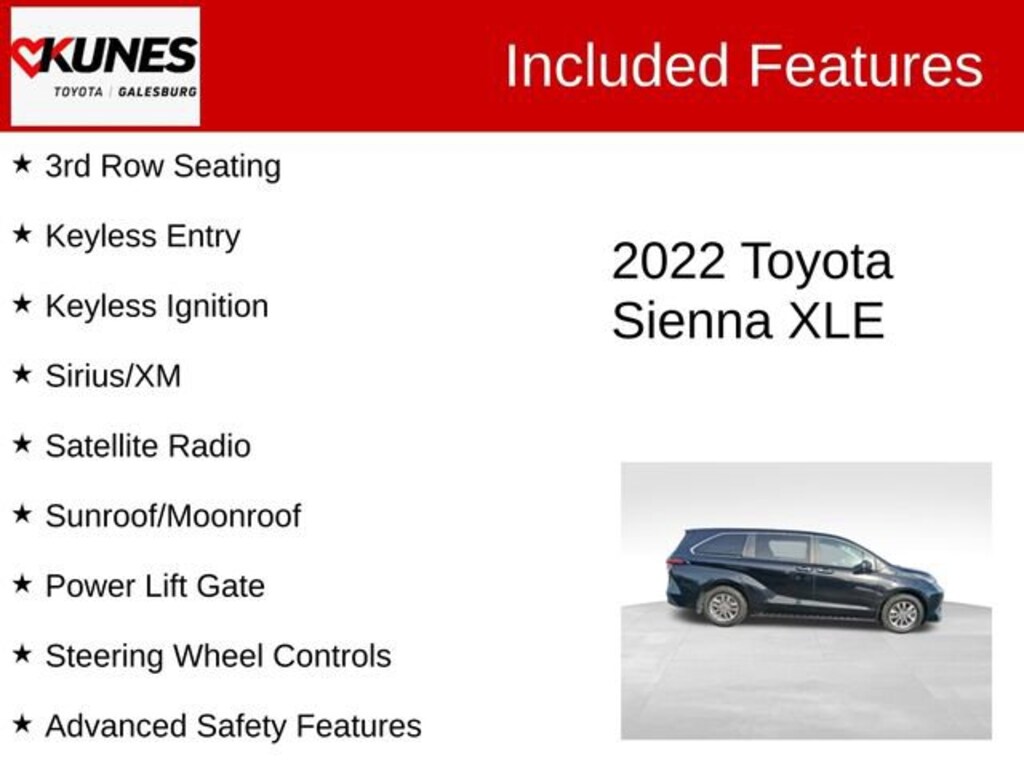 Kunes Toyota in Galesburg, IL treats the needs of each individual customer with paramount concern. We know that you have high expectations, and as a car dealer we enjoy the challenge of meeting and exceeding those standards each and every time. Allow us to demonstrate our commitment to excellence! Our experienced sales staff is eager to share its knowledge and enthusiasm with you. We encourage you to browse our online inventory, schedule a test drive and investigate financing options. These prices are subject to change. Prices shown do not include taxes, license, and title fees and a $377.63 documentary service fee.