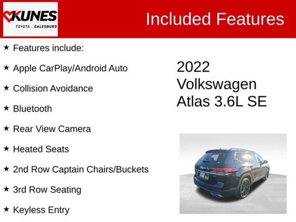 2022 Volkswagen Atlas 3.6L V6 SE w/Technology Deep Black Recent Arrival! CARFAX One-Owner. Features include:, Apple CarPlay/Android Auto, Collision Avoidance, Bluetooth, Rear View Camera, Heated Seats, 2nd Row Captain Chairs/Buckets, 3rd Row Seating, Keyless Entry, Keyless Ignition, Remote Start, Sirius/XM, Satellite Radio, MP3 player, Tow Package, Power Lift Gate, Steering Wheel Controls, Advanced Safety Features, ONE OWNER, NO ACCIDENTS, WHAT A BEAUTY BEING OFFERED HERE, HURRY ON THIS ONE !.